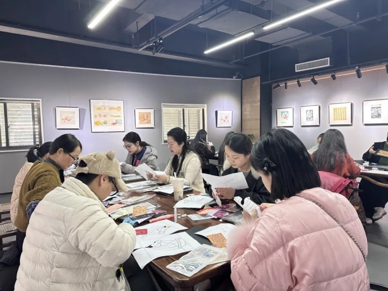 活动现场,长桌上整齐摆放着精美的宋锦面料、圆润的珍珠、专业的画框以及各式工具。与普通缝制不同,本次活动的核心在于“镶嵌”与“构图”。
